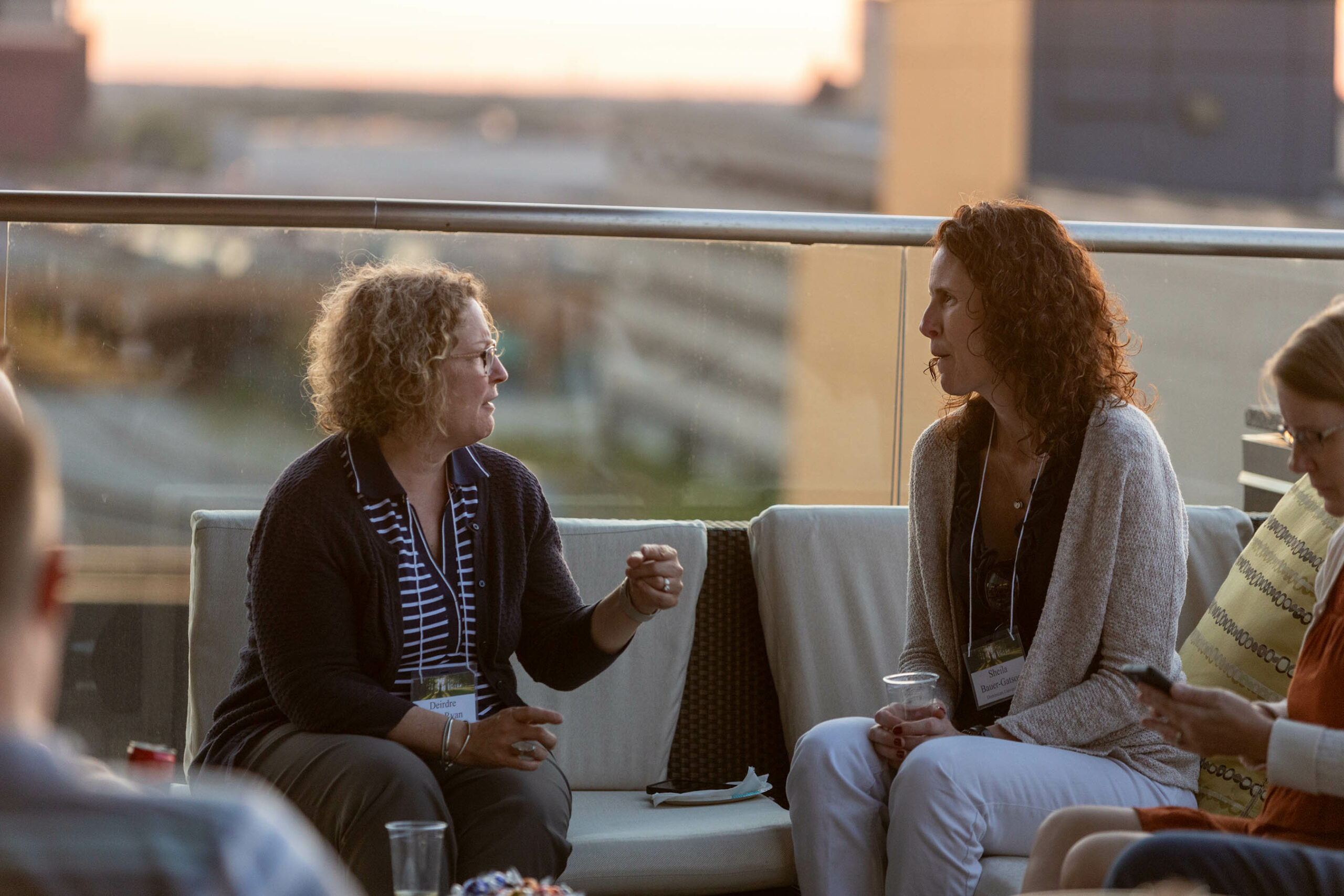 Seminar participants leisurely sit outside the Alexander as the sun sets behind them