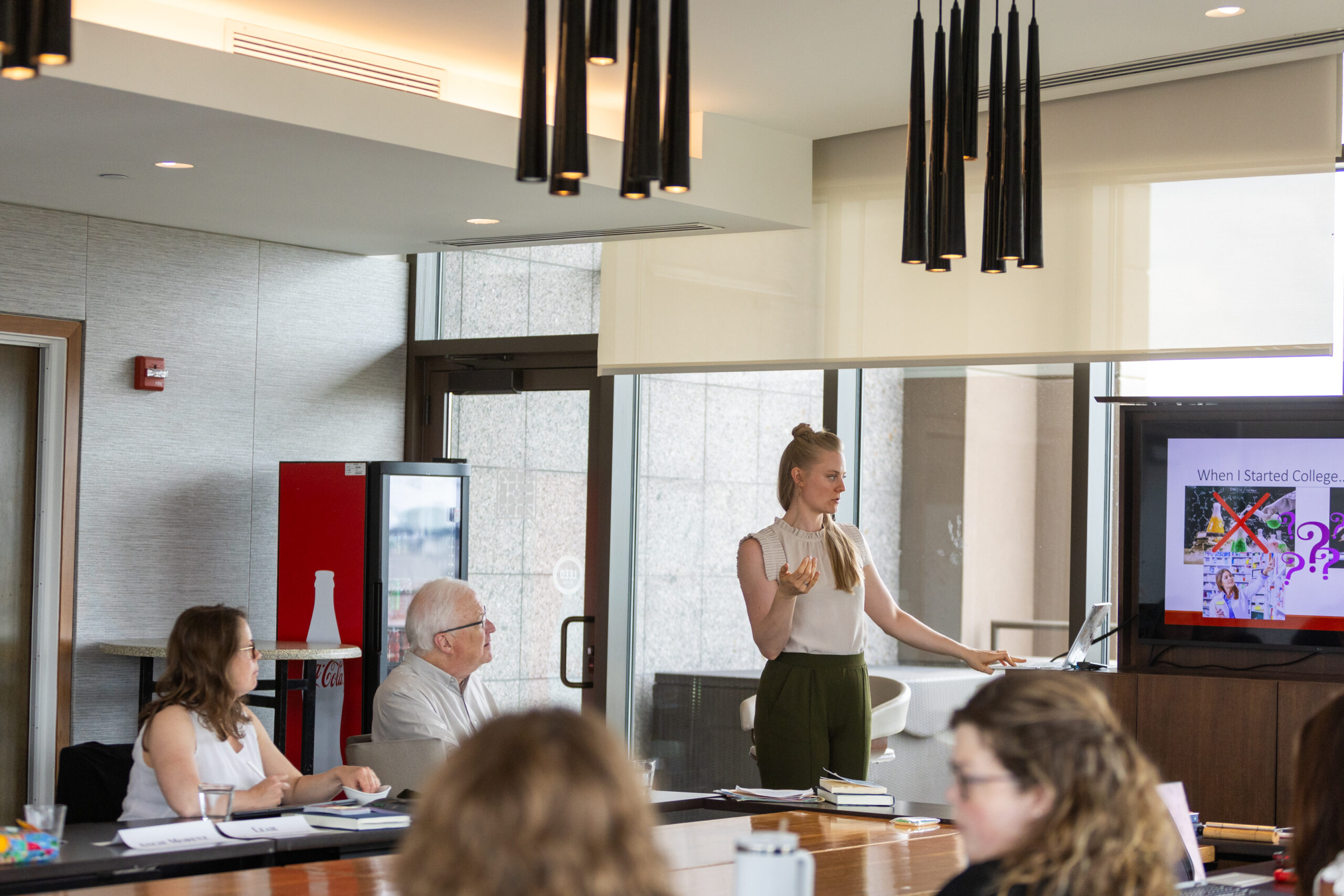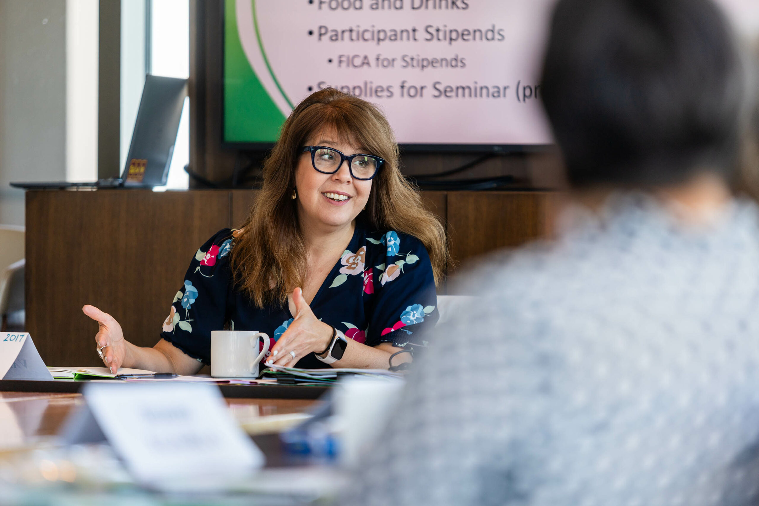 A woman seated at a table of gathering participants, talking. Other participants are listening attentively.